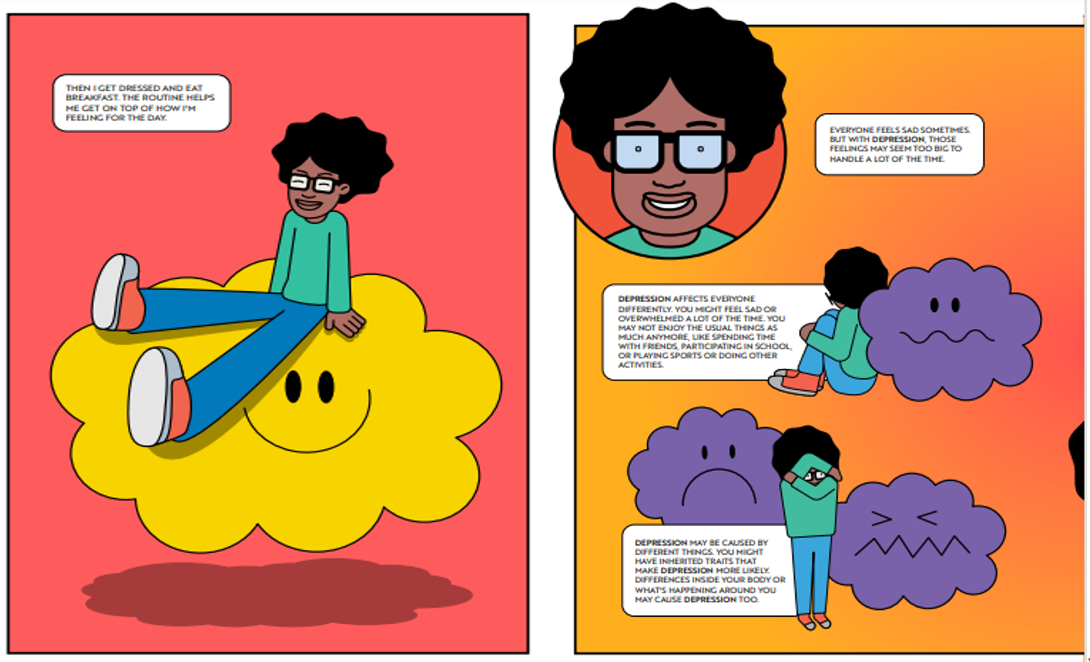 作家兼插画家海·吉(Hey Gee)讲述了一位现实生活中妙佑医疗国际患者的故事。通过第一人称叙述,这本书让我们一睹儿童管理抑郁症的日常生活、挑战和应对技巧。色彩和视觉技巧将情感的起伏带入生活,产生强大的影响。精美插图的图形非虚构方法提供了儿童视角,了解与这种常见的心理健康状况一起生活,甚至超越这种常见的心理健康状况。