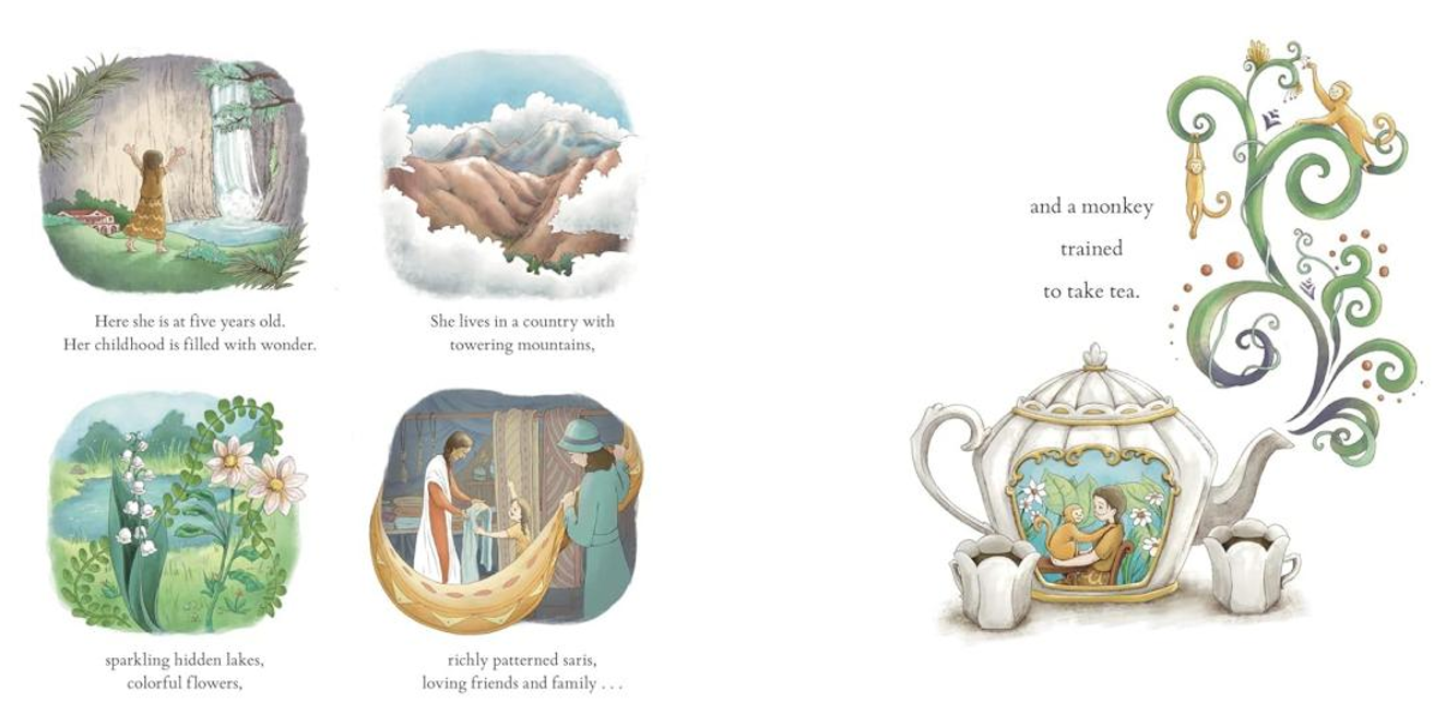 Young Pauline Baynes lives in India, a land of towering mountains, sparkling lakes, and bright flowers. She even has a pet monkey that joins her for tea.