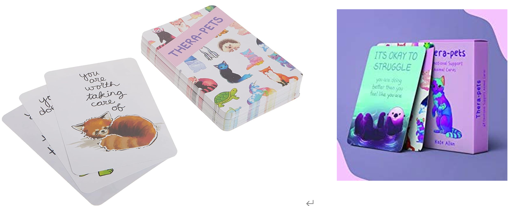 《疗愈萌宠》(Thera-Pets)卡片套装采用全彩盒装设计,内含 64 张彩色插画卡片。每张卡片都呈现着一只惹人喜爱的萌宠形象,搭配一段鼓舞人心的正向肯定语,为你提振心情、抚慰心灵。