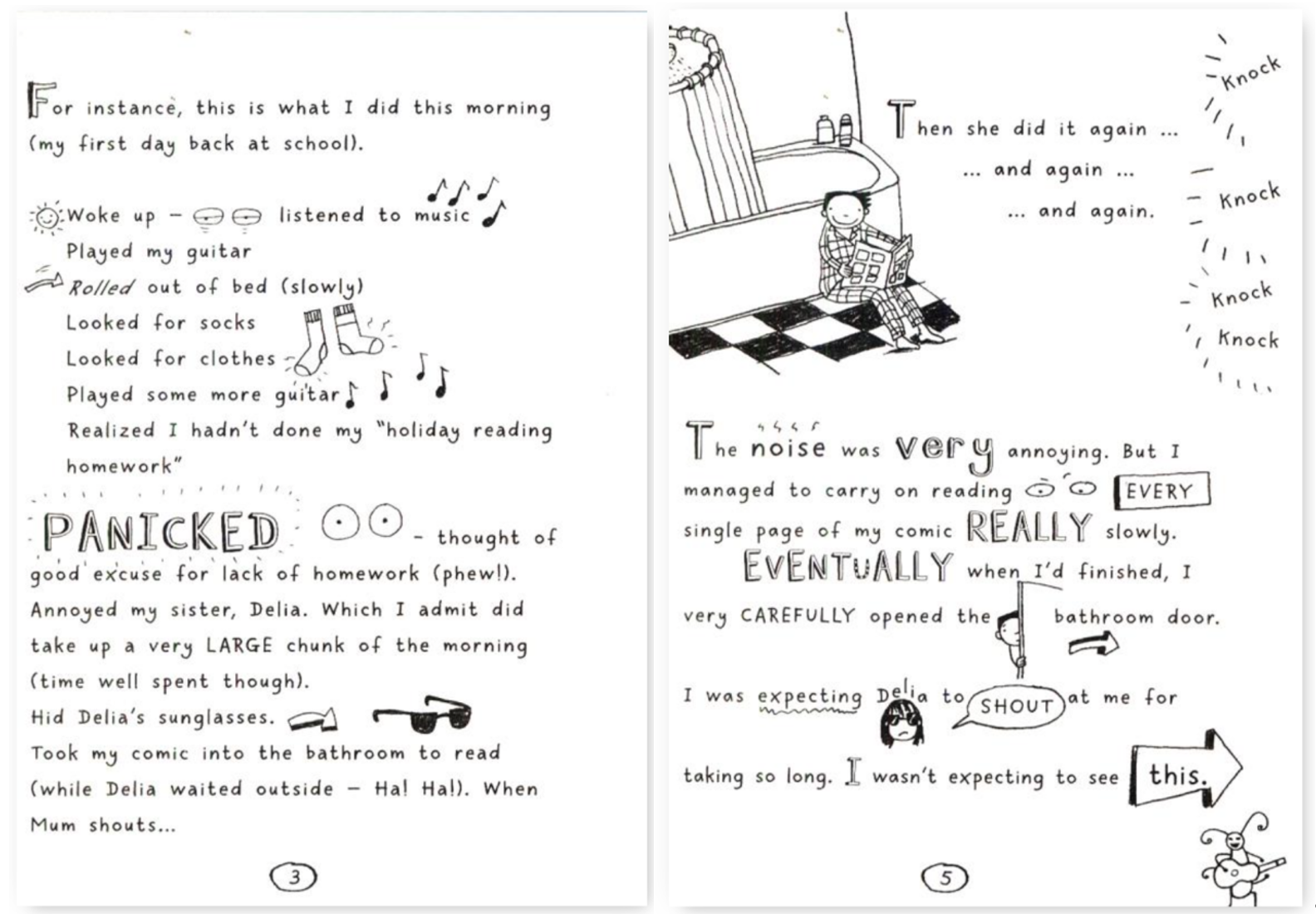 当我的老师富勒曼先生(Mr. Fullerman)不拿那双“鹰眼”盯着我时,我最喜欢画画、写写关于生活的趣事,比如我们有过的最糟假期(露营真是太糟了),还有我爸妈来参加家长会那次(唉……)。