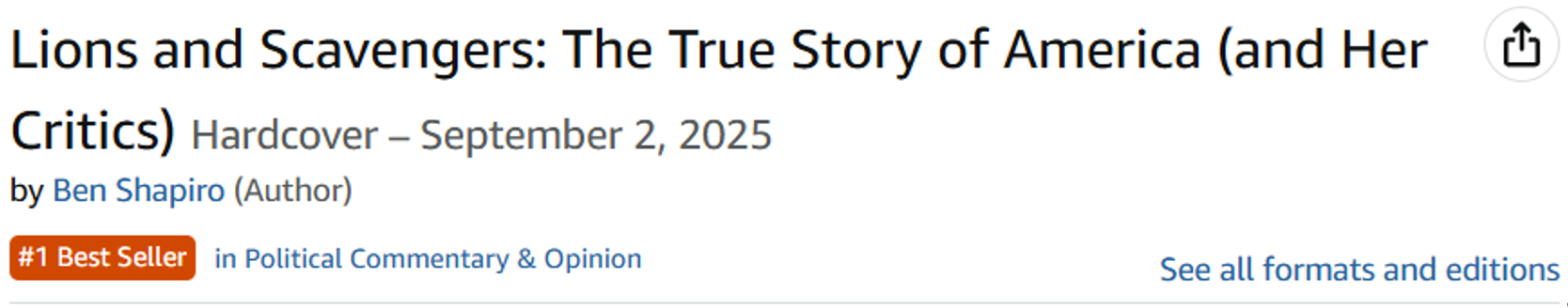 来自《纽约时报》畅销书榜首作家、Daily Wire联合创始人、《本·夏皮罗秀》主持人、知名作家兼保守派思想领袖本·夏皮罗——《狮子与鬣狗》。本在X平台拥有780万粉丝,YouTube 719万,Facebook 940万,Instagram 440万,能通过多渠道直接触达庞大读者群体。本还将在其Daily Wire平台与播客节目重点推广此书。