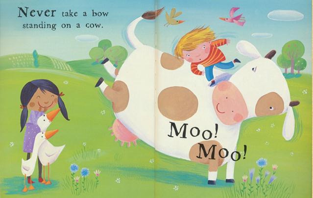 “不要睡在老虎背上”“不要闯入大熊的巢穴 ”“不要与蛇分享你的蛋糕”“看到鳄鱼要快快跑远”“不要追赶绵羊”“不要跟着小狗趟入泥沼”“不要骑在牛背上弯下腰”“不要试图将大鲸鱼装入你的小桶里”“可以与小猴们一同欢乐的舞蹈!”。