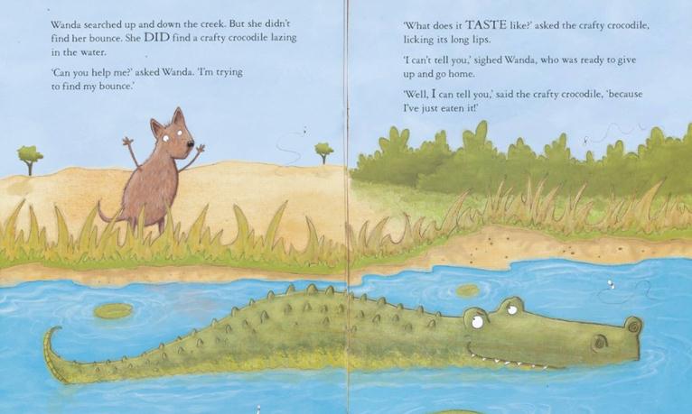 旺达开始了自己的寻找之旅,它询问它遇到的小动物刺猬、蝙蝠和地鼠。但由于旺达也不知道“跳跳”究竟是什么摸样,什么味道和感觉,无法描述出来,所以它的朋友们也没办法为它支招。最后旺达来到了一个池塘边看到了鳄鱼,它向鳄鱼说出了自己的想法,鳄鱼说“你的‘跳跳’在我嘴里,你到我嘴里来吧。”旺达听信了鳄鱼的话,到它嘴里寻找起来。这时,鳄鱼突然要合上嘴巴,Wanda一下子受到了惊吓,跳了出来。奇妙的是,这一惊之后,旺达会跳跃了,它找到了它的“跳跳”!