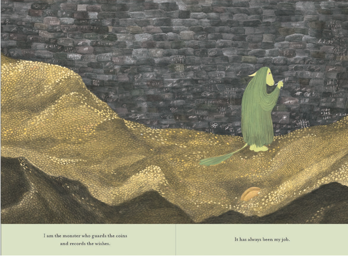“叮咚!叮当!叮咚!”许愿者的硬币一枚接一枚地掉进许愿井,落啊,落啊,落啊,直坠井底。井底住着一只孤独的怪物,他的任务就是数清所有这些硬币。他聆听着从井口上方传来的世间梦想,自己也渴望能进入那个世界。他梦想着有一天能离开这口潮湿的井,成为最富有的怪物。